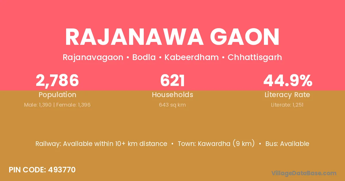 Kawardha (9 km) is the nearest town to Rajanawa Gaon village for major economic activities and is located approximately 9 km away.