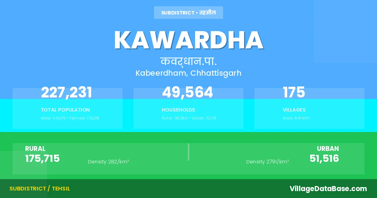 According to the 2011 census The total area of Kawardha Tehsil is 641 km², with a population of 227231 people. The population density is 355 inhabitants per square kilometre, and there are approximately 49564 houses in the sub district.