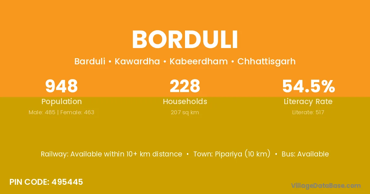 Pipariya (10 km) is the nearest town to Borduli village for major economic activities and is located approximately 10 km away.