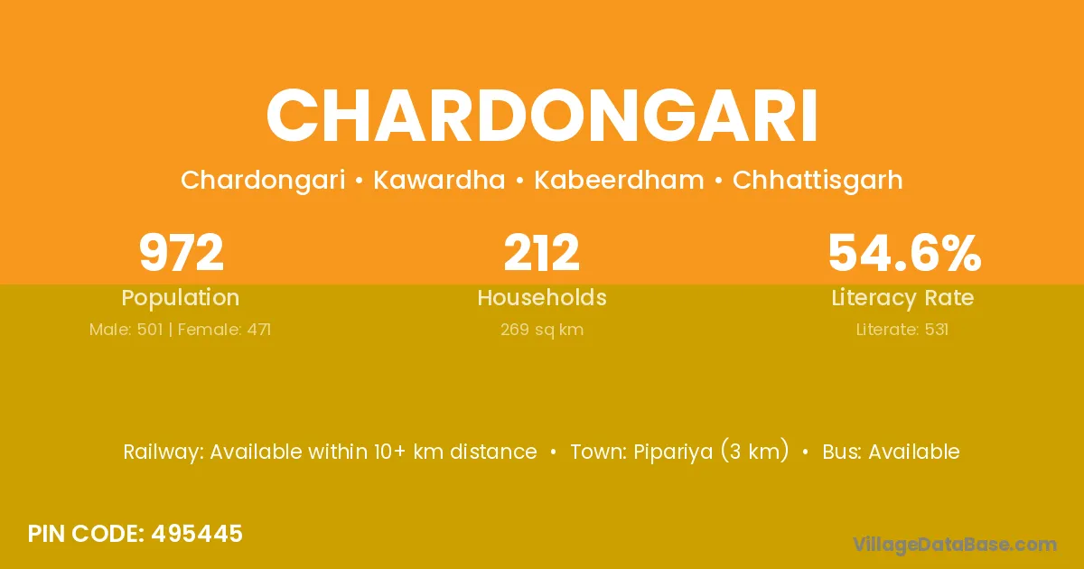 Pipariya (3 km) is the nearest town to Chardongari village for major economic activities and is located approximately 3 km away.