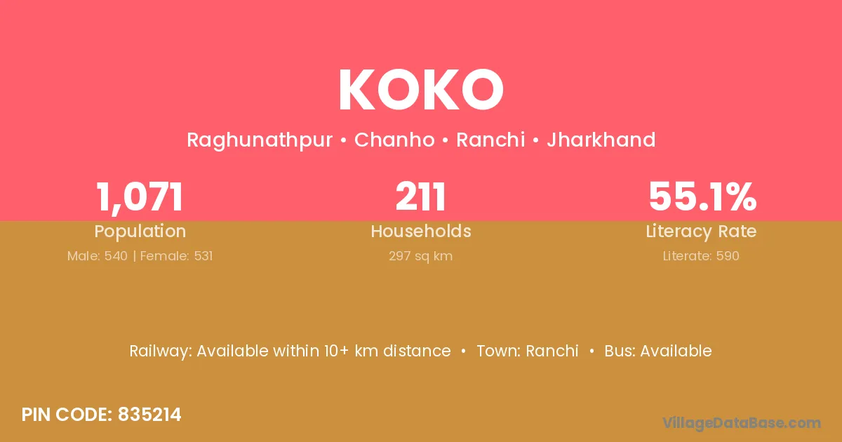 The literacy rate of Koko village is 52.74%. Male literacy stands at 63.60% and female literacy at 40.78%.
