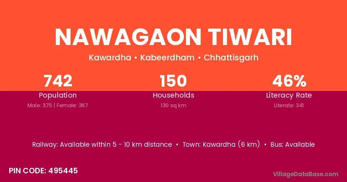 Kawardha (6 km) is the nearest town to Nawagaon Tiwari village for major economic activities and is located approximately 6 km away.