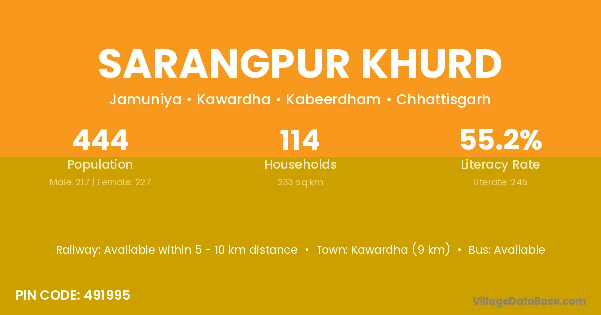 Kawardha (9 km) is the nearest town to Sarangpur Khurd village for major economic activities and is located approximately 9 km away.