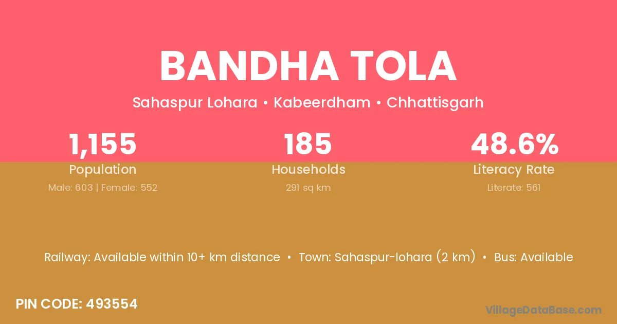 Bandha Tola village has a total population of 1,155 people, of which 603 are males and 552 are females.