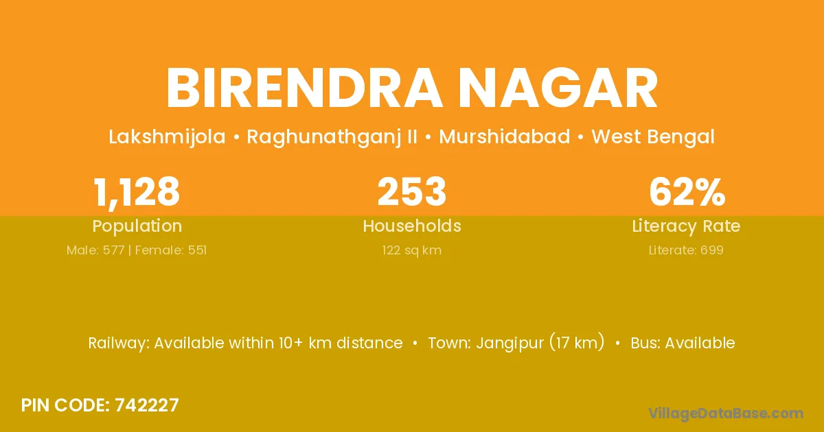 The literacy rate of Birendra Nagar village is 54.06%. Male literacy stands at 64.39% and female literacy at 43.42%.