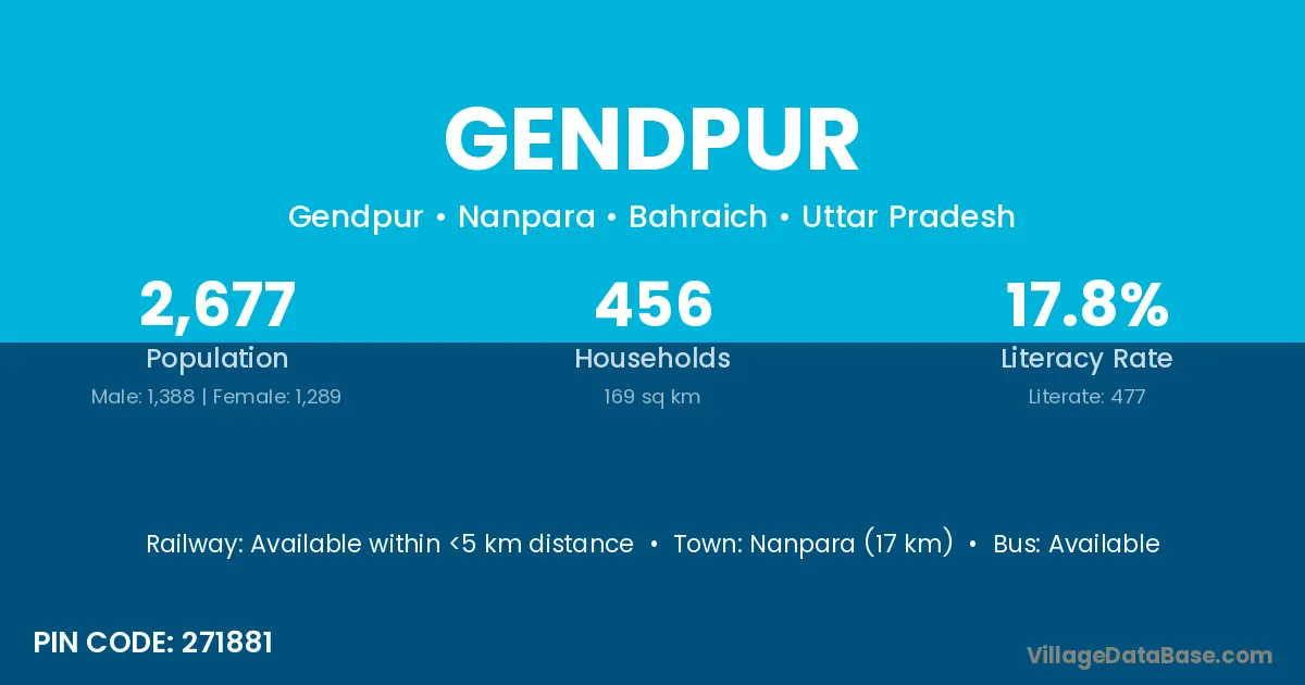 Kawardha (30 km) is the nearest town to Gendpur village for major economic activities and is located approximately 30 km away.