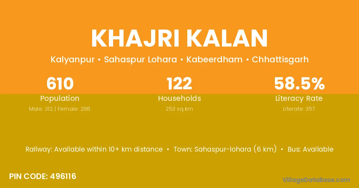 Khajri Kalan village has a total population of 610 people, of which 312 are males and 298 are females.