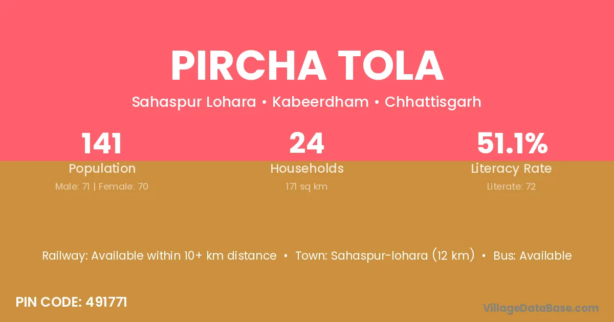 Pircha Tola village is located in the Sahaspur Lohara Tehsil of the Kabeerdham district in Chhattisgarh .