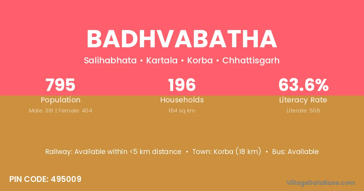 Korba (18 km) is the nearest town to Badhvabatha village for major economic activities and is located approximately 18 km away.