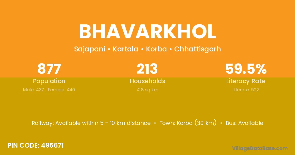 Korba (30 km) is the nearest town to Bhavarkhol village for major economic activities and is located approximately 30 km away.