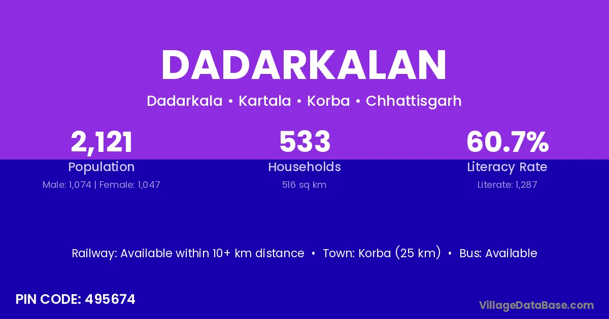 Korba (25 km) is the nearest town to Dadarkalan village for major economic activities and is located approximately 25 km away.