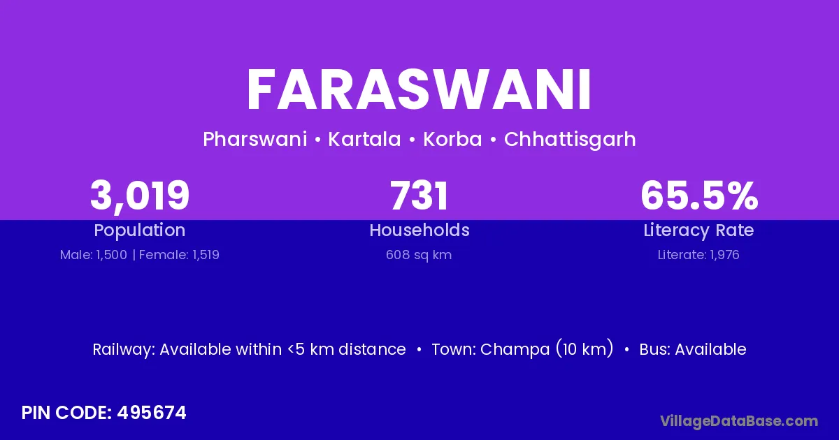Champa (10 km) is the nearest town to Faraswani village for major economic activities and is located approximately 10 km away.