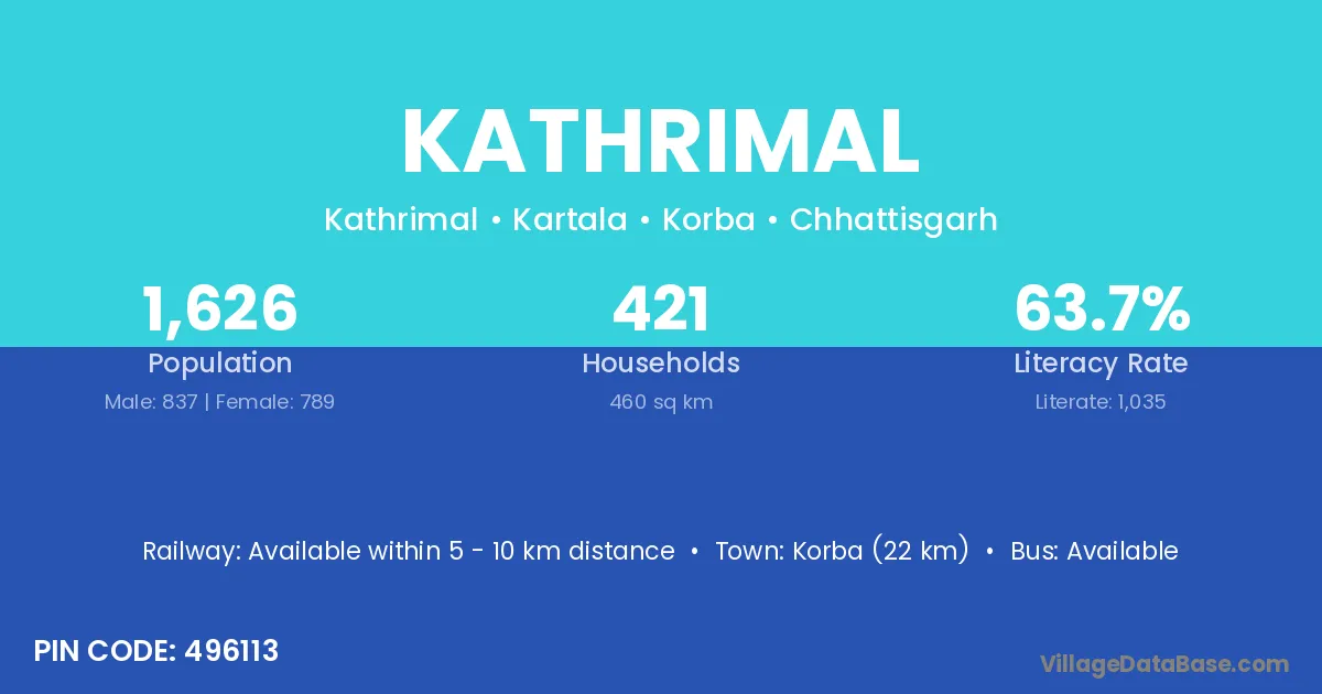Korba (22 km) is the nearest town to Kathrimal village for major economic activities and is located approximately 22 km away.