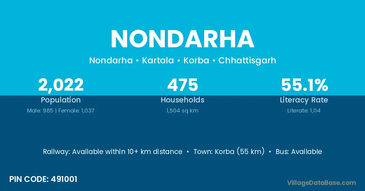 Korba (55 km) is the nearest town to Nondarha village for major economic activities and is located approximately 55 km away.