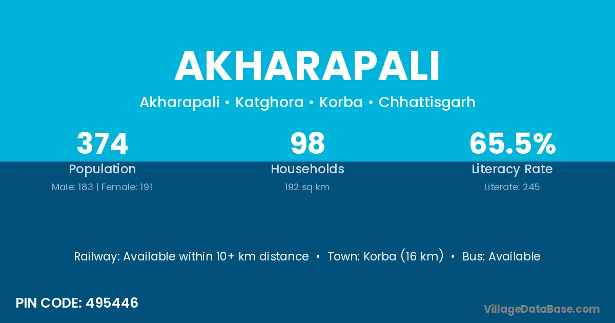 Korba (16 km) is the nearest town to Akharapali village for major economic activities and is located approximately 16 km away.