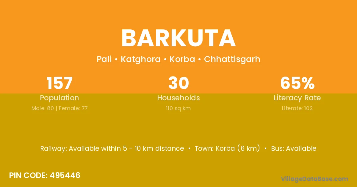 Korba (6 km) is the nearest town to Barkuta village for major economic activities and is located approximately 6 km away.