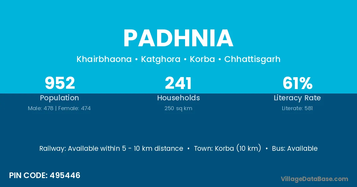 Korba (10 km) is the nearest town to Padhnia village for major economic activities and is located approximately 10 km away.