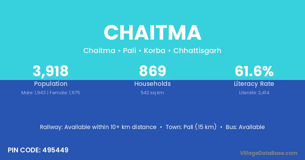 Chaitma village has a total population of 3,918 people, of which 1,943 are males and 1,975 are females.