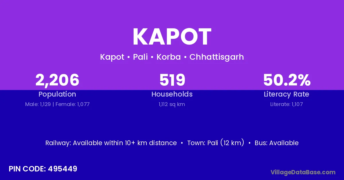 Kapot village has a total population of 2,206 people, of which 1,129 are males and 1,077 are females.