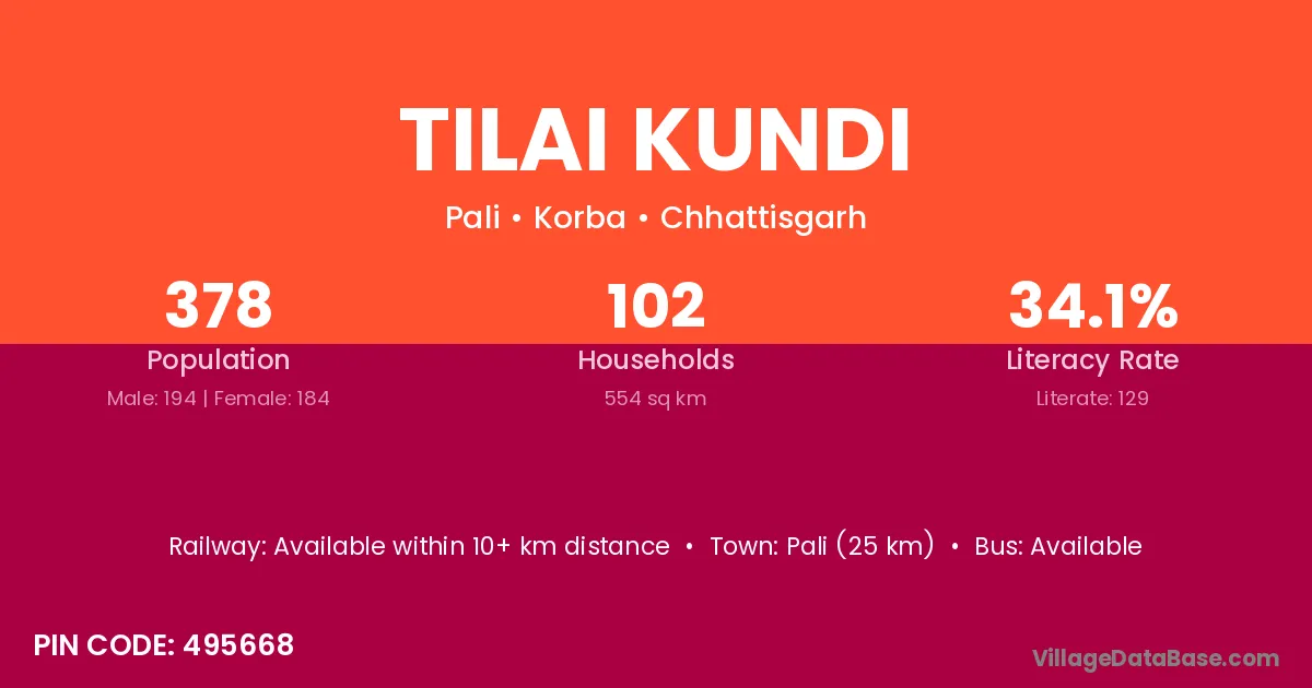Tilai Kundi village has a total population of 378 people, of which 194 are males and 184 are females.
