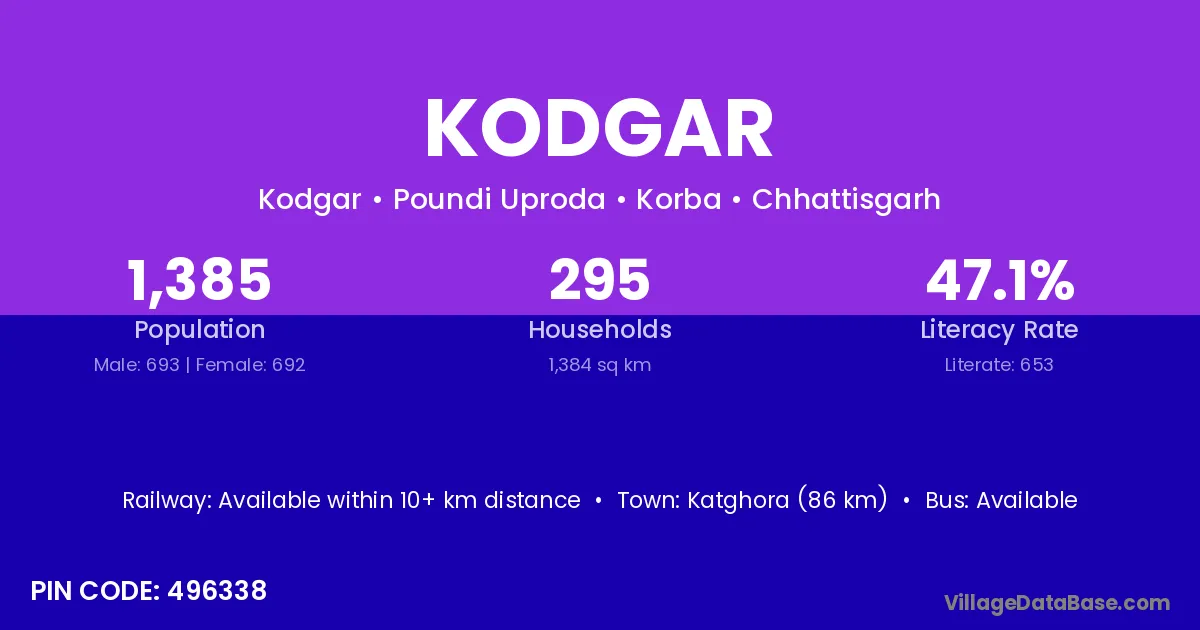 Katghora (86 km) is the nearest town to Kodgar village for major economic activities and is located approximately 86 km away.