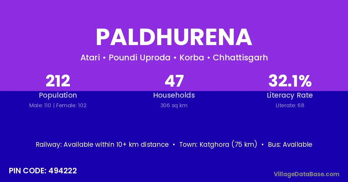 Katghora (75 km) is the nearest town to Paldhurena village for major economic activities and is located approximately 75 km away.