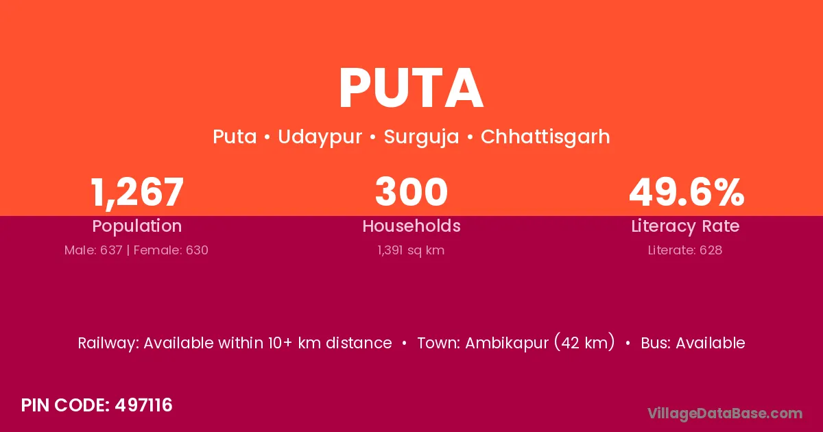 Katghora (75 km) is the nearest town to Puta village for major economic activities and is located approximately 75 km away.