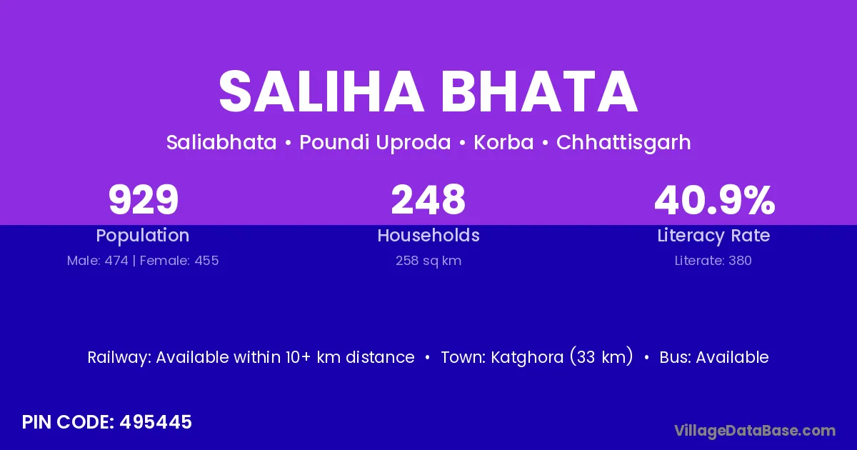 Katghora (33 km) is the nearest town to Saliha Bhata village for major economic activities and is located approximately 33 km away.