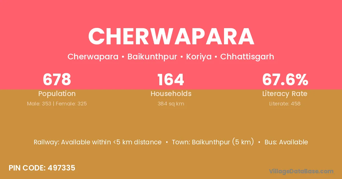 Baikunthpur (5 km) is the nearest town to Cherwapara village for major economic activities and is located approximately 5 km away.