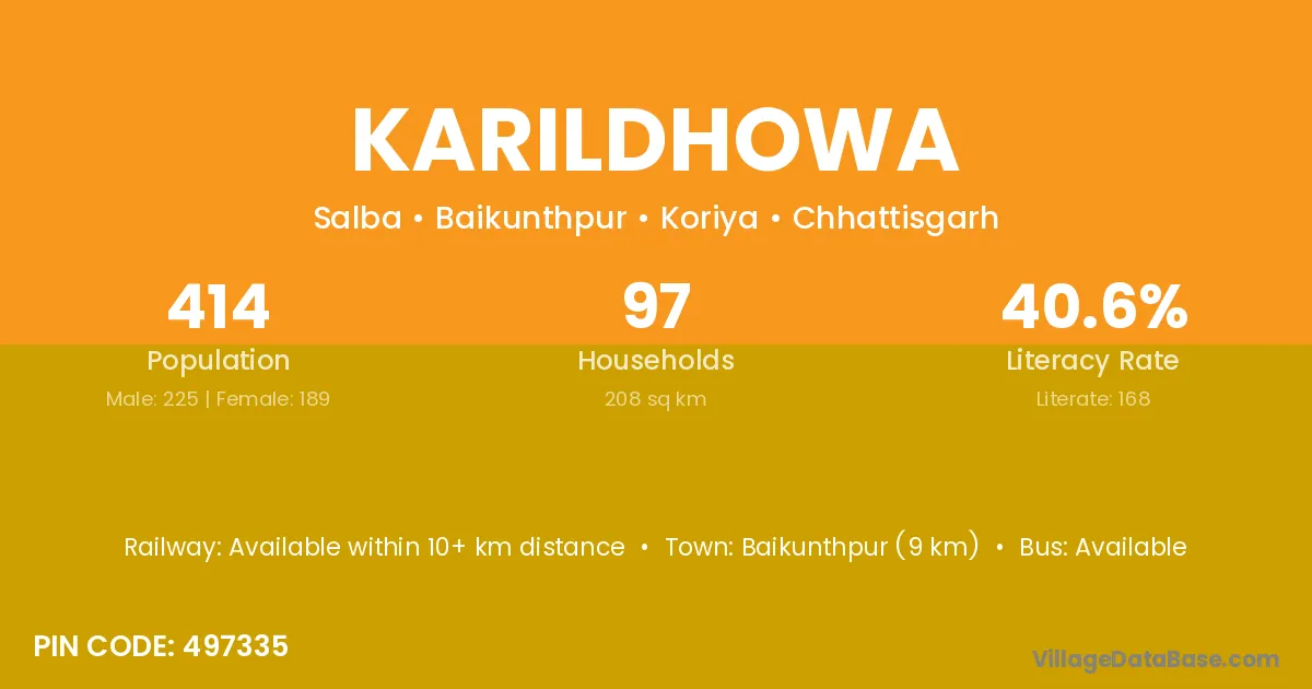 Karildhowa village has a total population of 414 people, of which 225 are males and 189 are females.