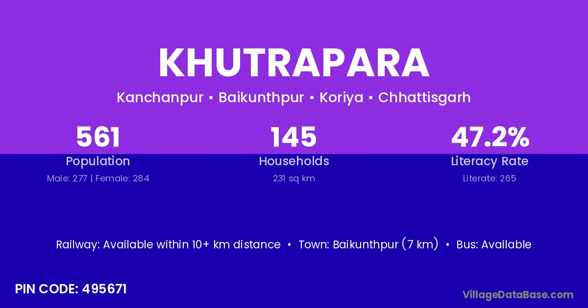 Khutrapara village has a total population of 561 people, of which 277 are males and 284 are females.