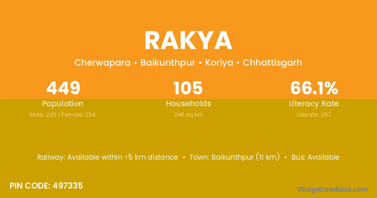 Baikunthpur (11 km) is the nearest town to Rakya village for major economic activities and is located approximately 11 km away.