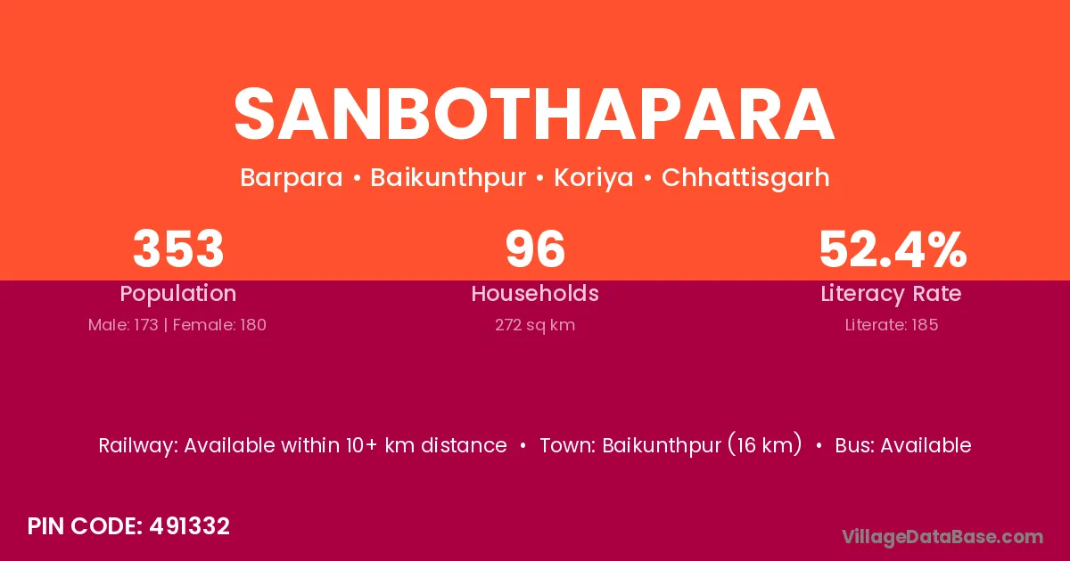 Sanbothapara village has a total population of 353 people, of which 173 are males and 180 are females.