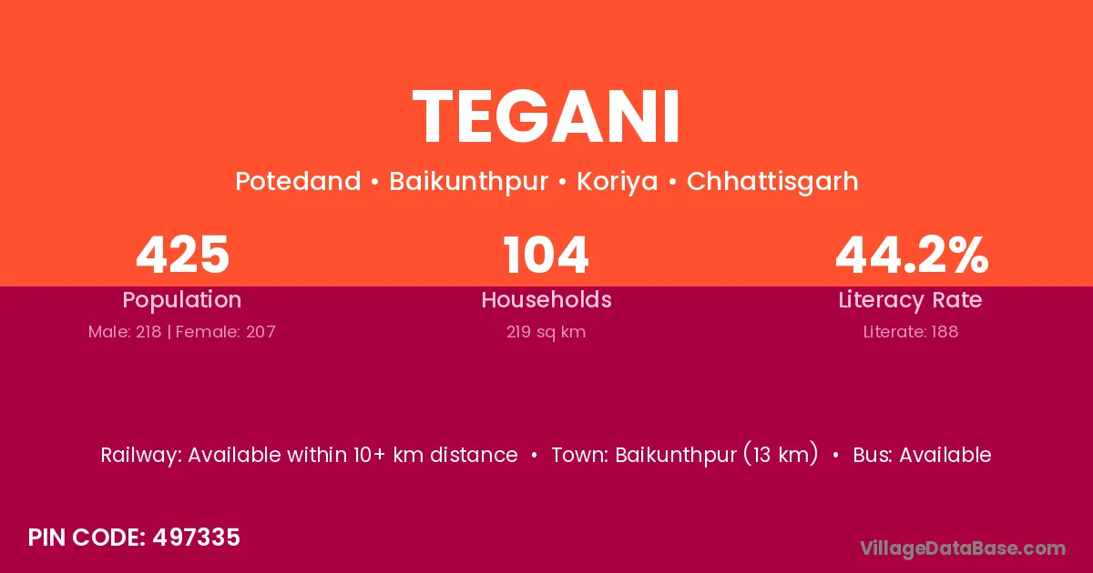 Tegani village is located in the Baikunthpur Tehsil of the Koriya district in Chhattisgarh .