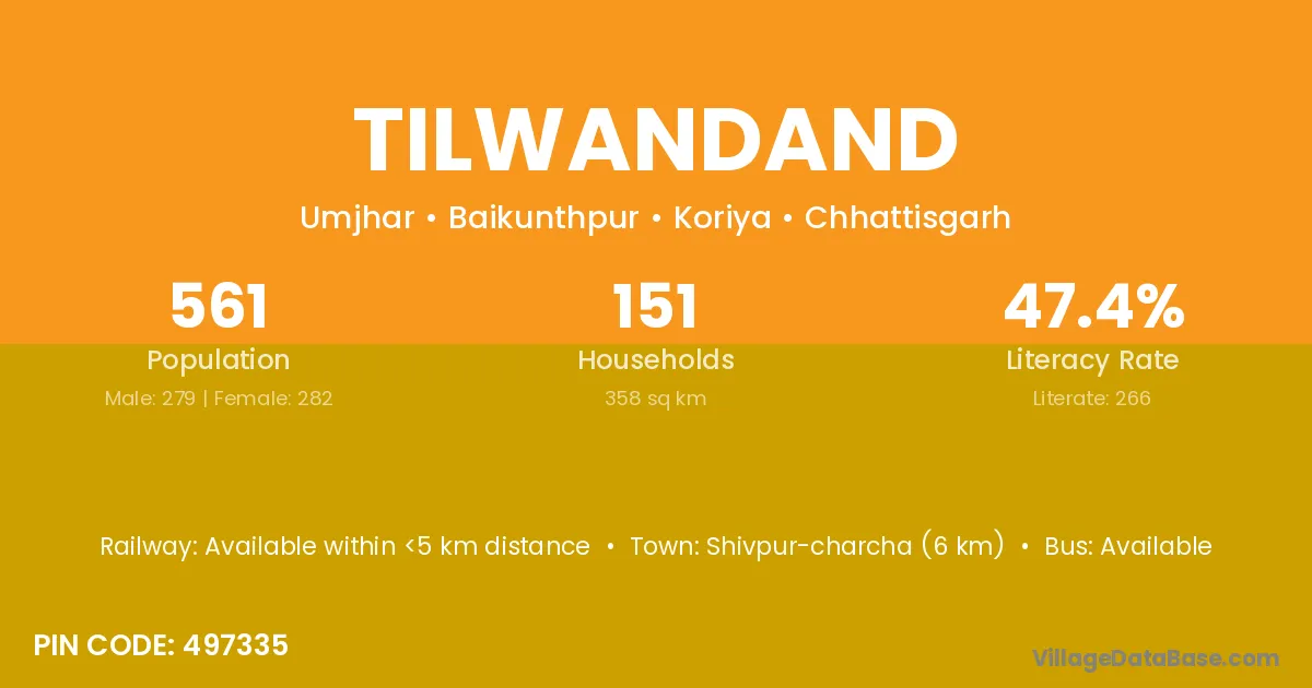 Tilwandand village has a total population of 561 people, of which 279 are males and 282 are females.