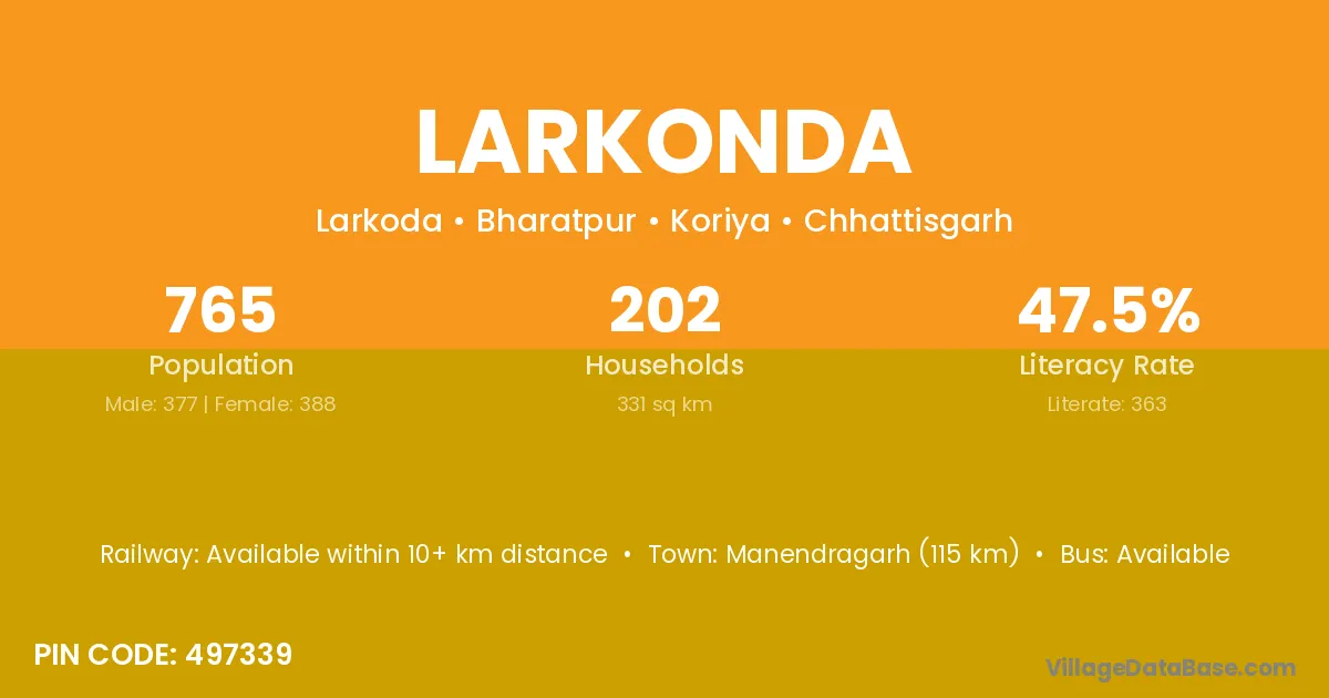 Manendragarh (115 km) is the nearest town to Larkonda village for major economic activities and is located approximately 115 km away.