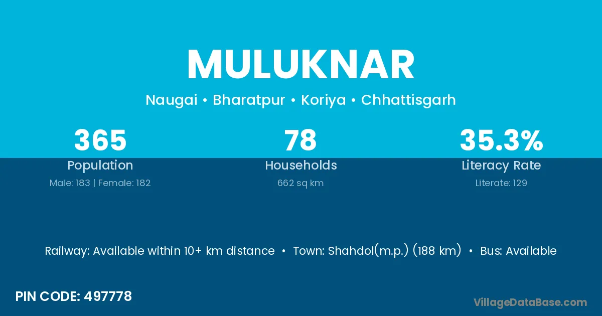 Muluknar village has a total population of 365 people, of which 183 are males and 182 are females.