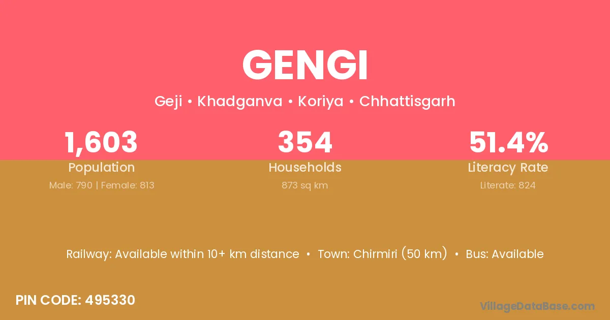 Chirmiri (50 km) is the nearest town to Gengi village for major economic activities and is located approximately 50 km away.