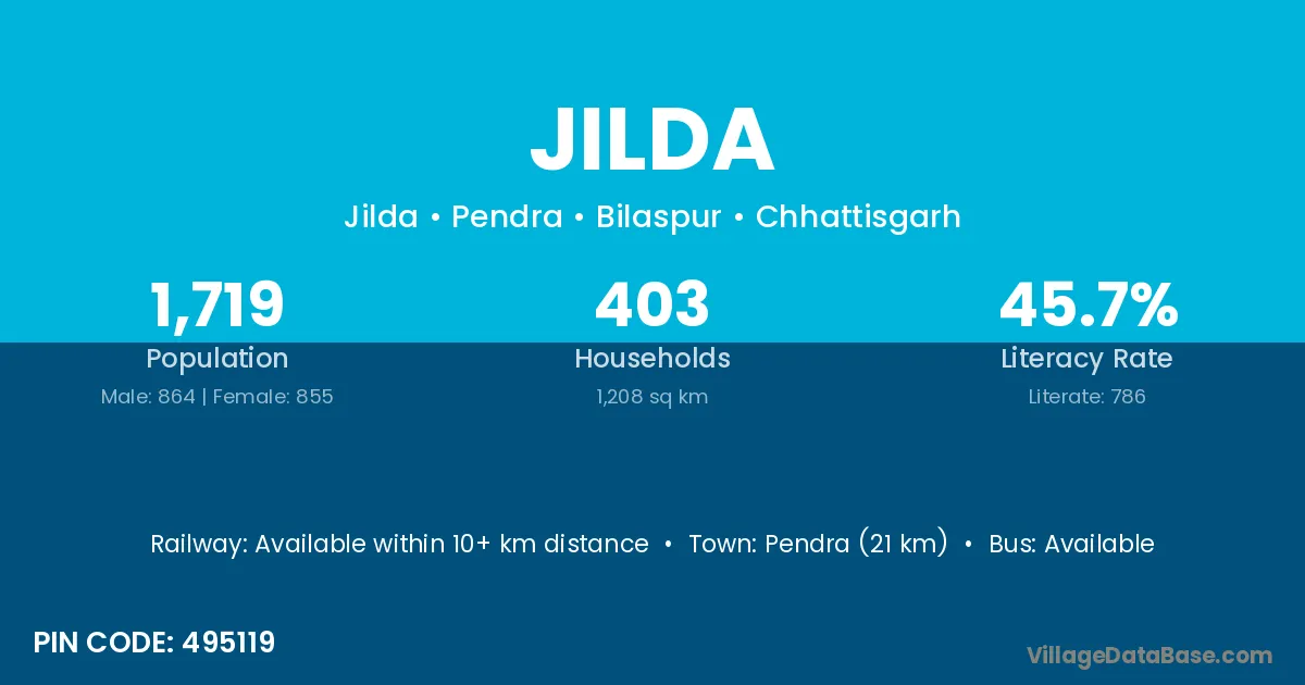 Chirmiri (35 km) is the nearest town to Jilda village for major economic activities and is located approximately 35 km away.