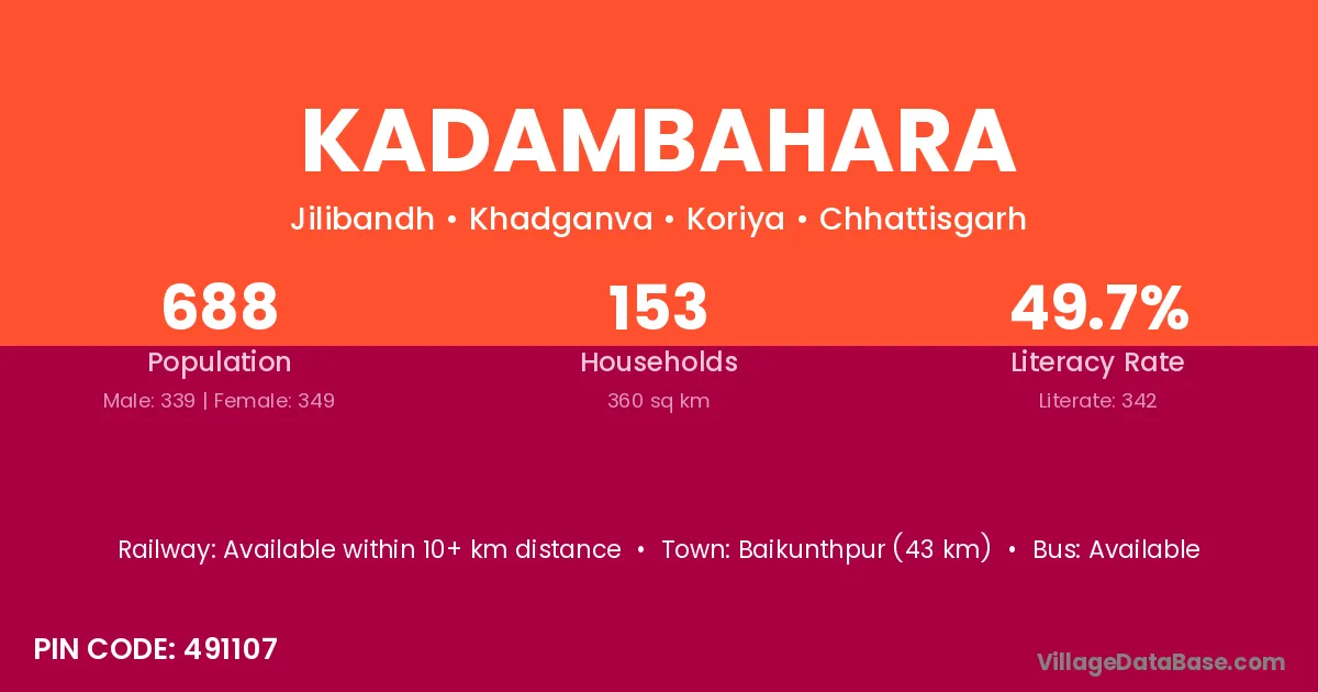Baikunthpur (43 km) is the nearest town to Kadambahara village for major economic activities and is located approximately 43 km away.