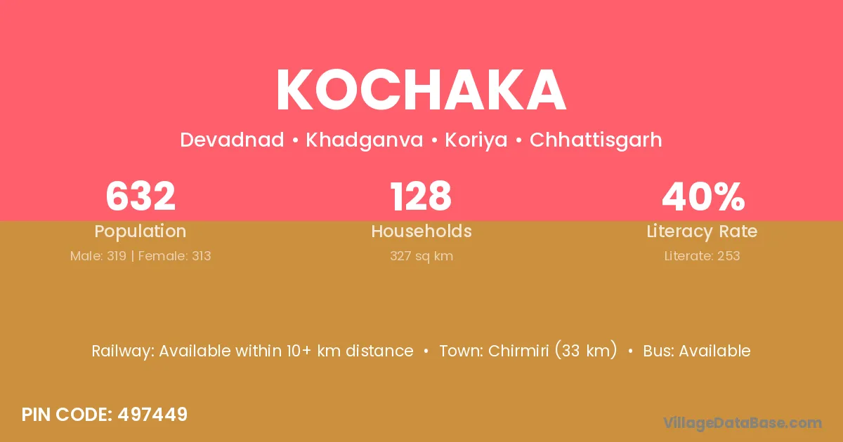 Chirmiri (33 km) is the nearest town to Kochaka village for major economic activities and is located approximately 33 km away.