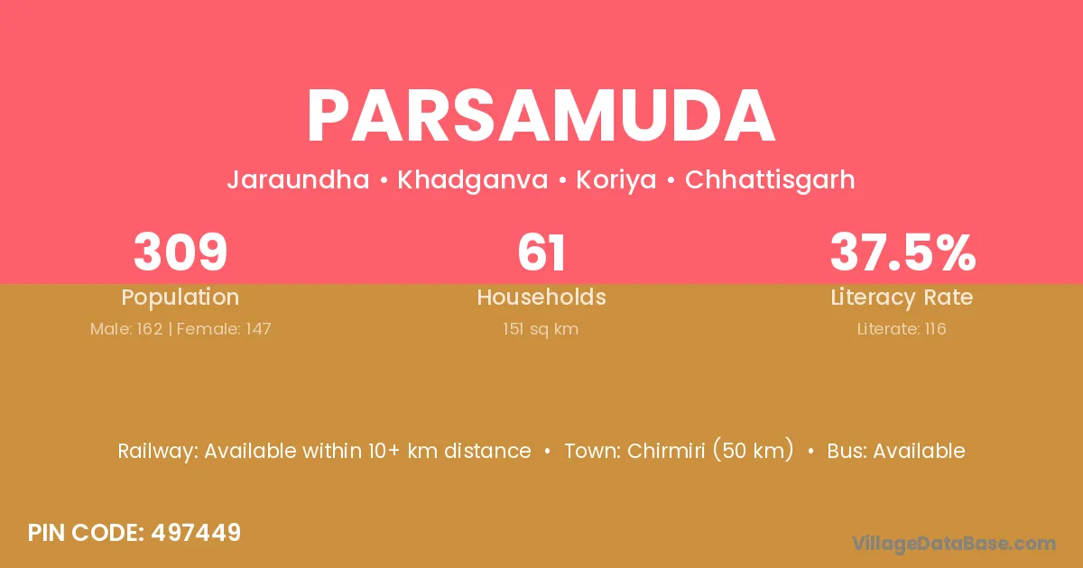 Chirmiri (50 km) is the nearest town to Parsamuda village for major economic activities and is located approximately 50 km away.