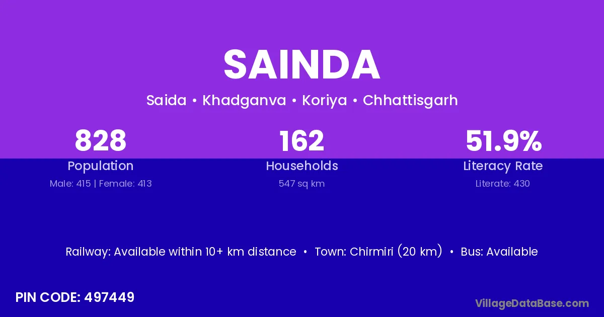 Chirmiri (20 km) is the nearest town to Sainda village for major economic activities and is located approximately 20 km away.
