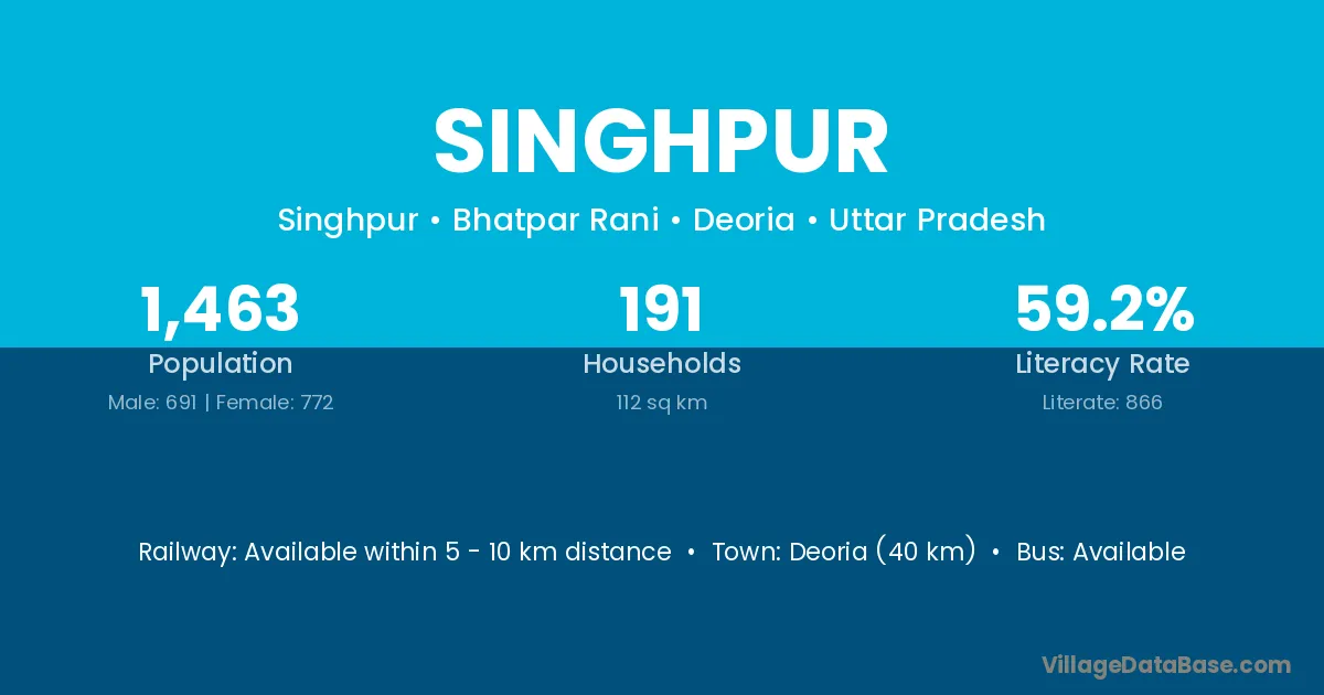 Chirmiri (18 km) is the nearest town to Singhpur village for major economic activities and is located approximately 18 km away.