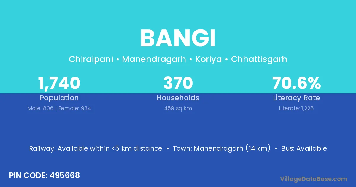 Manendragarh (14 km) is the nearest town to Bangi village for major economic activities and is located approximately 14 km away.