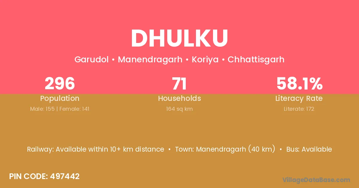 Manendragarh (40 km) is the nearest town to Dhulku village for major economic activities and is located approximately 40 km away.