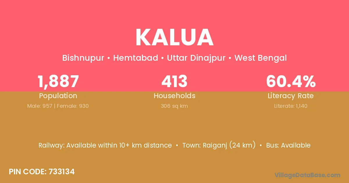 Kalua village has a total population of 237 people, of which 120 are males and 117 are females.