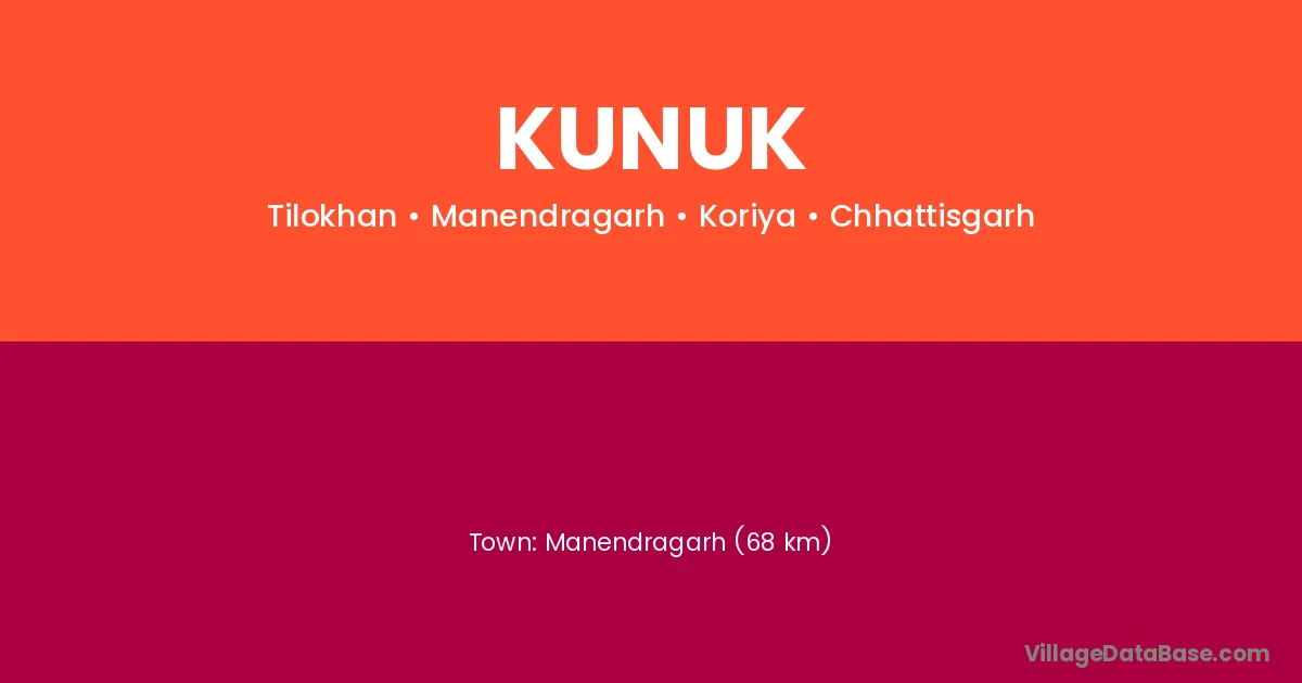 Manendragarh (68 km) is the nearest town to Kunuk village for major economic activities and is located approximately 68 km away.