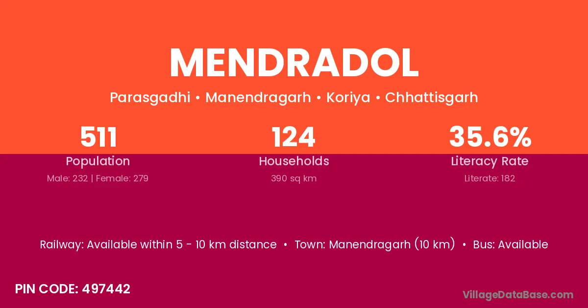 Manendragarh (10 km) is the nearest town to Mendradol village for major economic activities and is located approximately 10 km away.