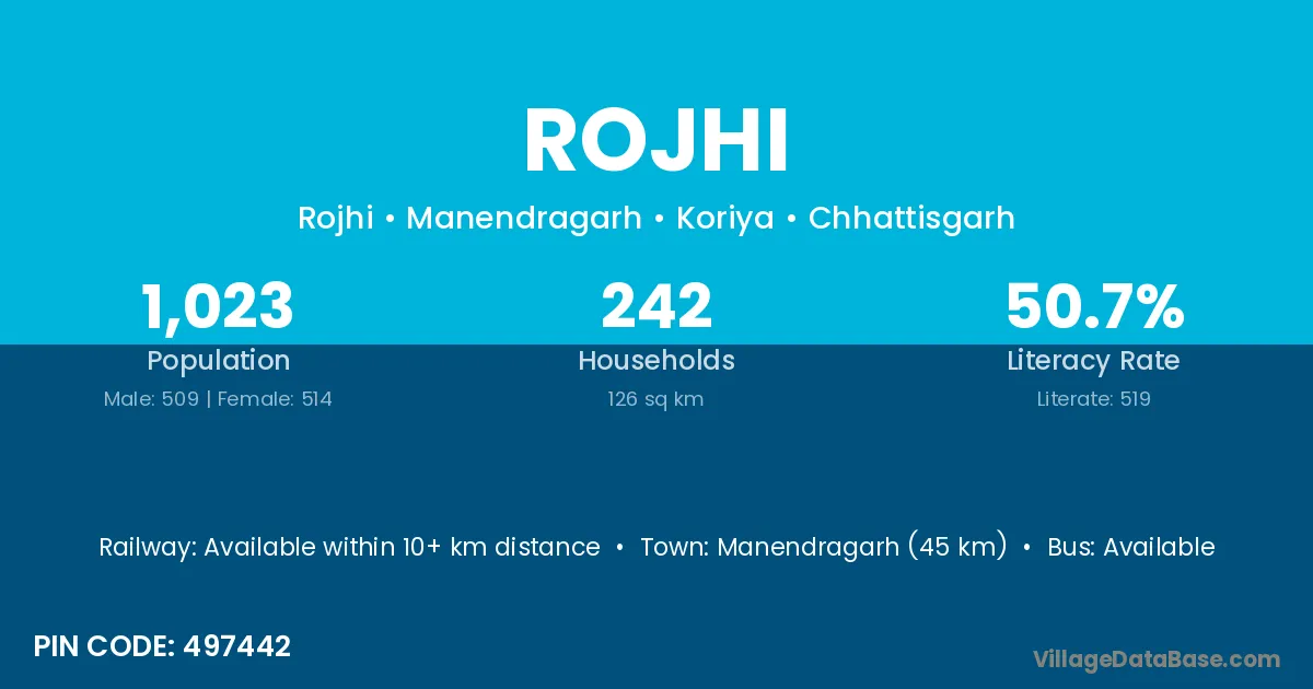 Manendragarh (45 km) is the nearest town to Rojhi village for major economic activities and is located approximately 45 km away.